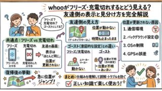 アプリ whooがフリーズ・充電切れするとどう見える?友達側の表示と見分け方を完全解説 whooで位置が止まったとき、「フリーズ?」「充電切れ?」「ゴーストにしてる?」と不安になりますよね。実はwhooでは、フリーズと充電切れは表示上ほとんど同じに見えるという仕様があります。この記事では、whooのフリーズや充電切れが友達にど... アプリ