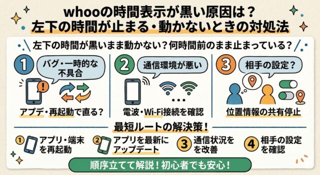 whooを使っていて「時間表示が黒くなった」「左下の時間が黒いまま動かない」「何時間前のまま止まっている気がする」と不安になったことはありませんか?